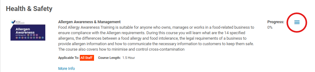 Click on Allergen Awareness & Management or Induction – Level 1 Health and Food Safety Equivalent in your course list.
